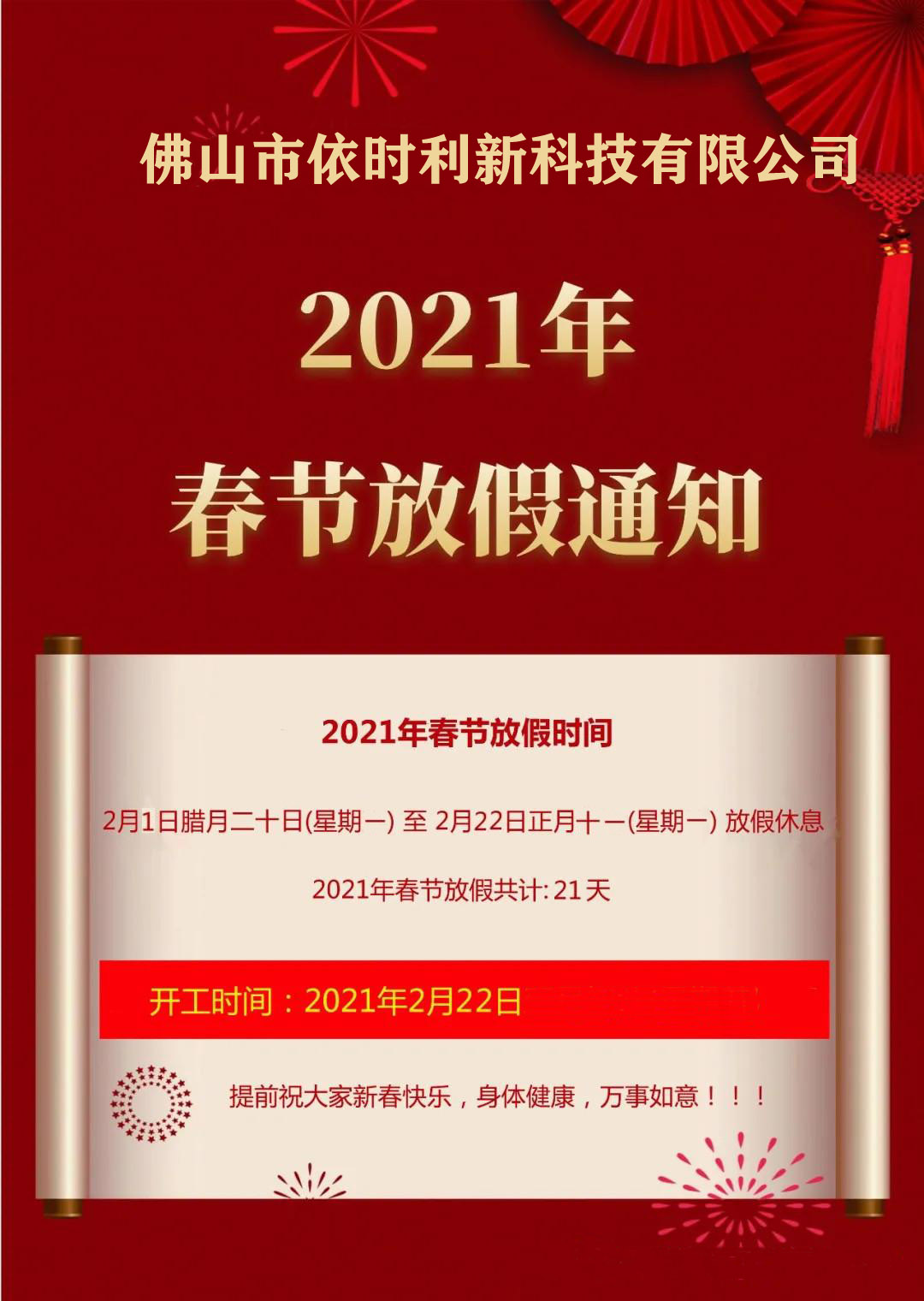 佛山市依時(shí)利新科技放假通知~2021年2月1日放假,2021年2月22日上班~
